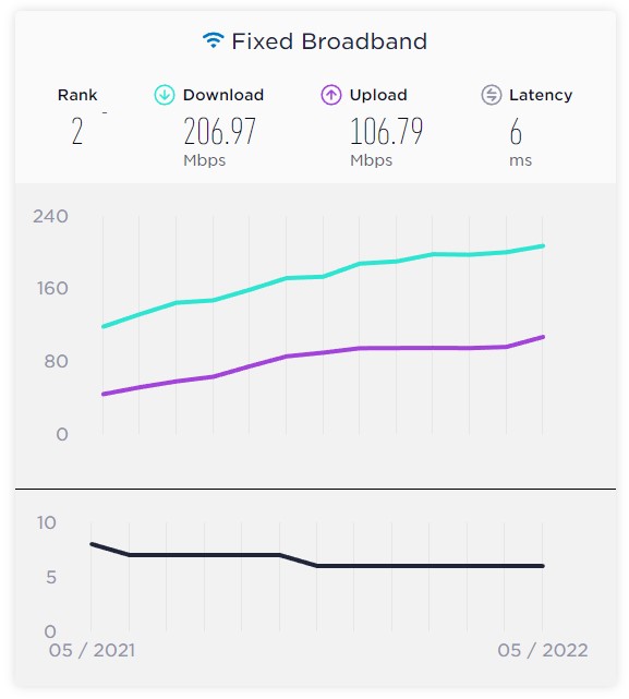 Los operadores fijos de Chile promedian 206.97 Mbps en descargas, 106.79 Mbps y latencia de 6 ms.
