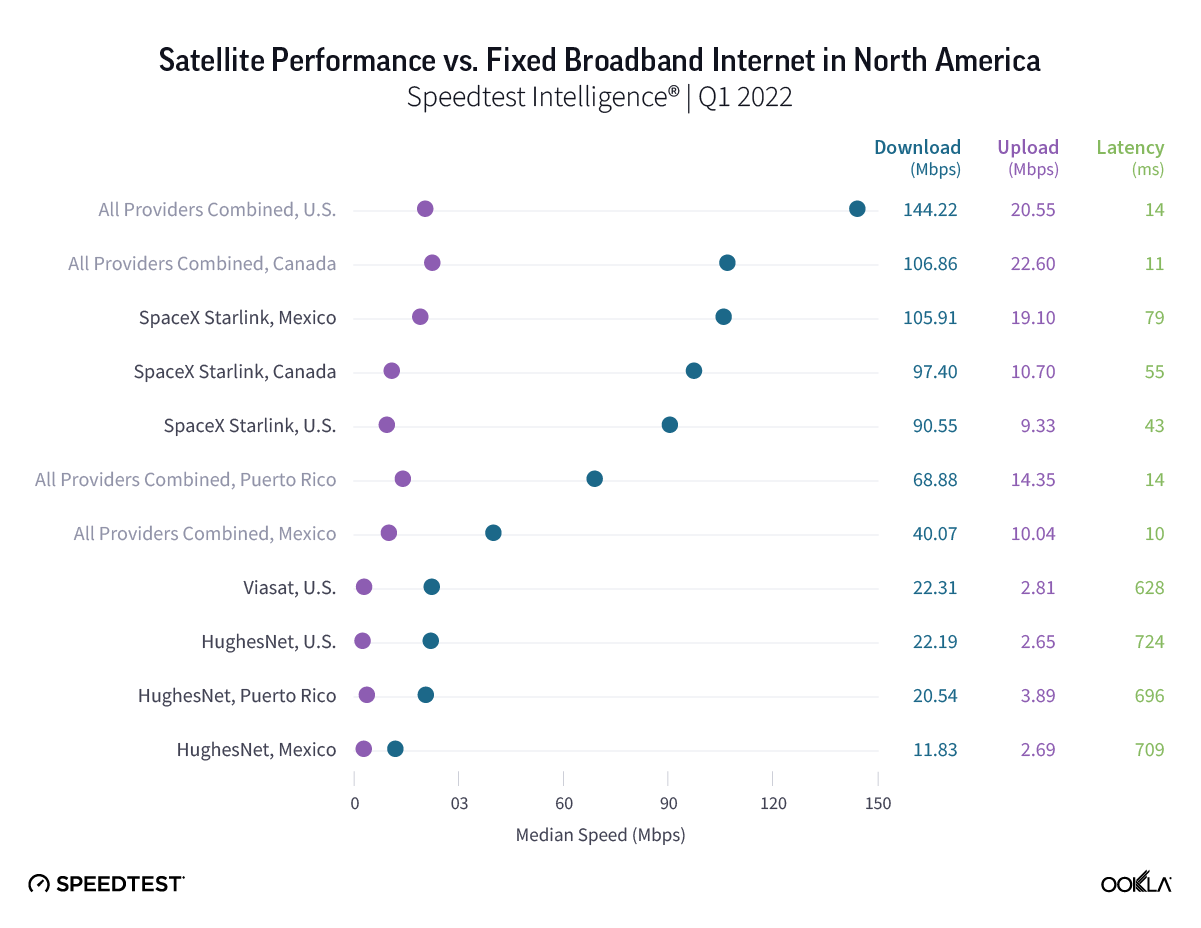 Tanto en México, Canadá y Estados Unidos, se ve a SpaceX por encima de los 90 Mbps de bajada, superando de lejos a Viasat y HughesNet, que tienen sus mejores velocidades apenas encima de los 22 Mbps.