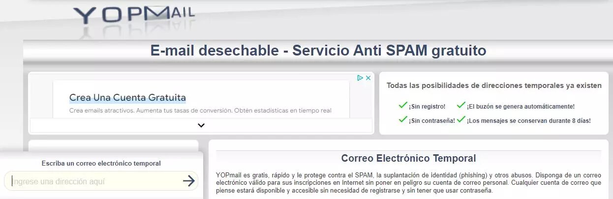 Hay todo tipo de webs o servicios que nos permiten crear correos temporales o correos desechables sin registro. Son muchas las páginas que podemos encontrar y elegir una u otra dependerá de qué queremos o cuál nos resulte más fácil de utilizar o más práctico. Lo que hacen estos emails es que puedes acceder a un correo electrónico durante un tiempo determinado y después olvidarte de él. Sin registro y sin dar tus datos personales. Conseguirás así ser anónimo y acceder a una web sin que luego te envíen información al correo.