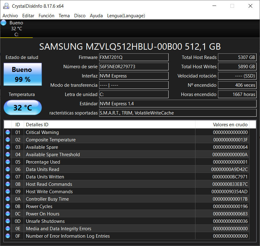• En ella veremos bastante información, como la unidad concreta instalada que en este caso corresponde a una SSD que Samsung vende a los OEM. También veremos la versión del protocolo NVMe usado o las características soportadas y que son importantes en este tipo de unidades, como TRIM o SMART.