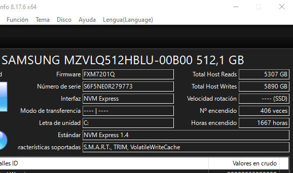 Además de esos parámetros, bastante visuales y claros, el otro valor que te puede indicar el estado de una SSD es el "Total Host Writes". que destaca los Tbytes escritos que citábamos más arriba.