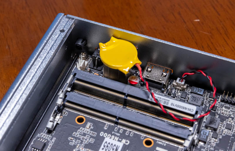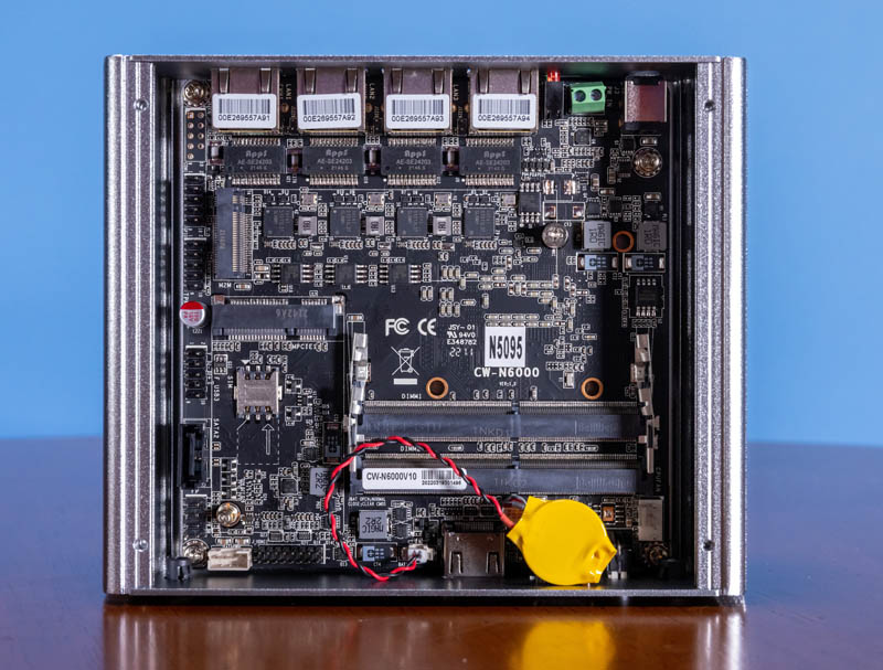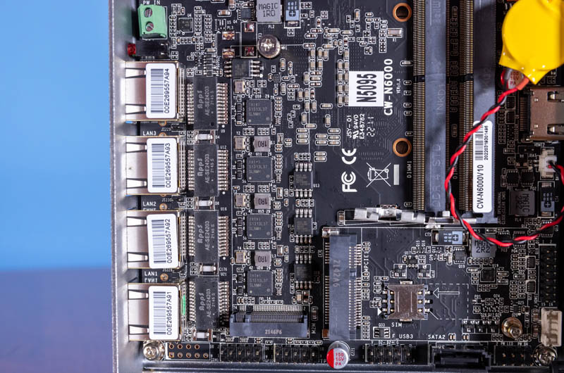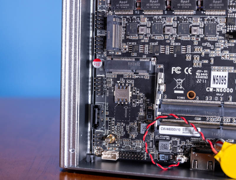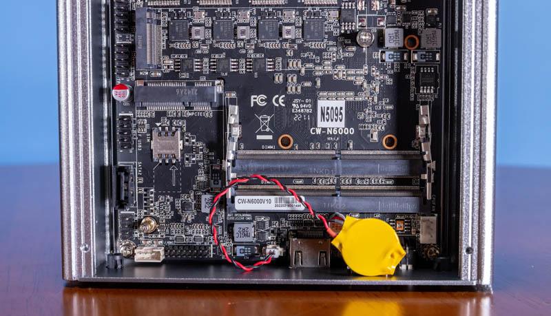 Aquí hay una vista interna del sistema. Esta es la misma placa base CW-N6000 que hemos visto en los sistemas N5105 y N6005, solo que con la etiqueta N5095.