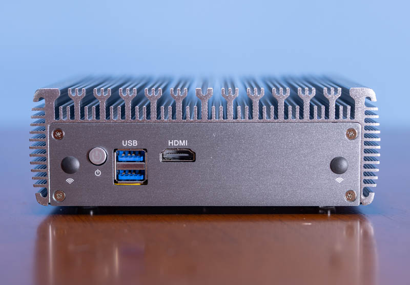 El frente de esta unidad tiene dos puertos USB 3.0 y un puerto HDMI. Hay un botón de encendido que se ilumina y orificios de antena. El chasis es principalmente de metal, pero las placas frontales eran de plástico. Notaremos rápidamente que con todas estas unidades ha sido común obtener un chasis diferente al que se muestra en las fotos en AliExpress.